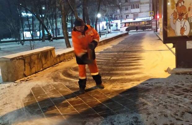С утра на улицах Симферополя 235 дворников обрабатывают дороги специальным противогололёдным реагентом. Об этом сообщили в пресс-службе администрации города.