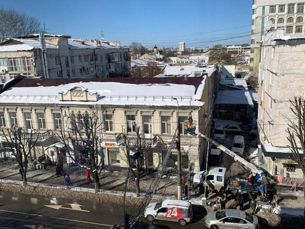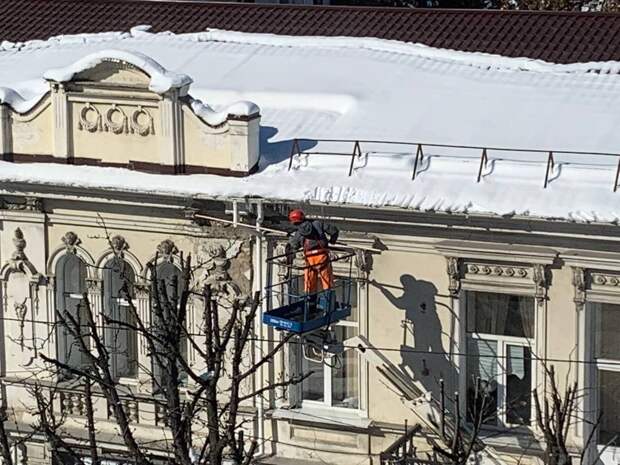 Так, одновременно чистят дома сразу несколько коммунальных бригад, с помощью вышки коммунальщики сбивают сосульки, которые нависают над тротуарной зоной.