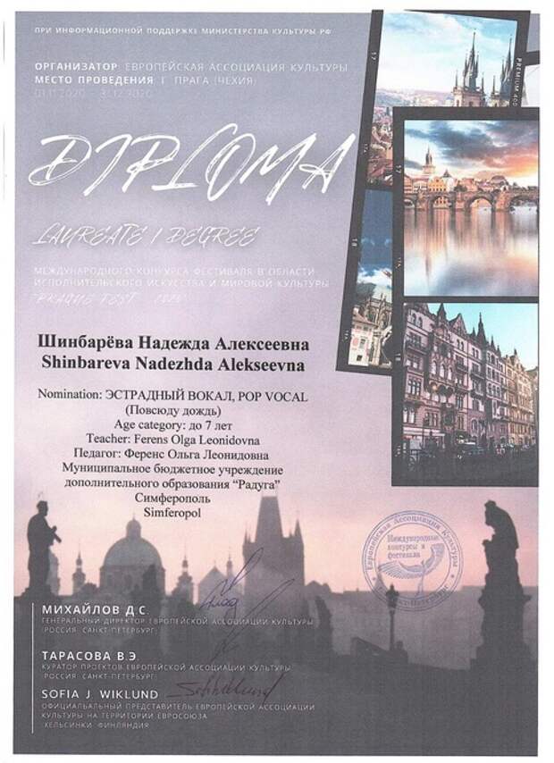 Совсем юная вокалистка Надежда Шинбарёва стала победителем организованного Европейской Ассоциацией Культуры в Праге международного творческого состязания в области исполнительского искусства и культуры “Prague Fest – 2020”. Об этом сообщает пресс-служба из Симферополя.