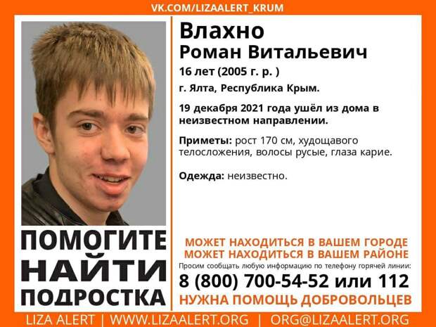 В Ялте без вести пропал 16-летний Роман Влахно. Об этом сообщает поисково-спасательный отряд «Лиза Алерт».