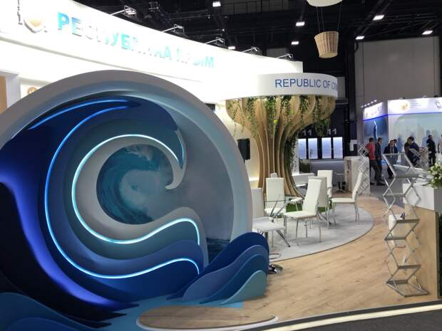 Отмечается, что стенд высотой в четыре метра и площадью 90 квадратных метров. На нем предусмотрены зоны для проведения деловых переговоров и подписания соглашений и меморандумов.